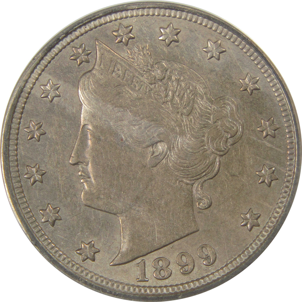 A genuine 1899 Repunched Date Liberty Head V Nickel Coin, graded and certified AU 50 Details by ANACS. Cleaned