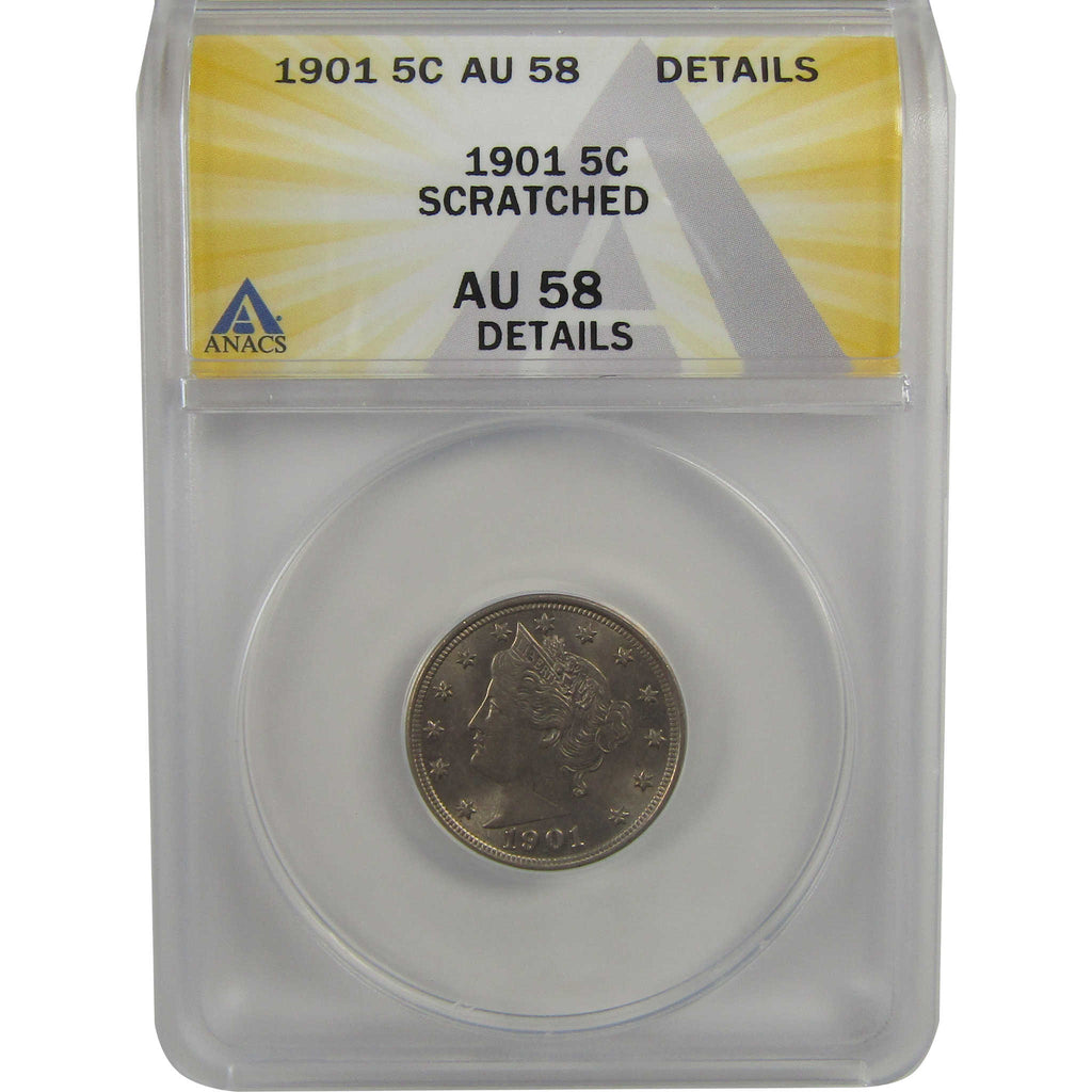 A genuine 1901 Liberty Head V Nickel Coin, graded and certified AU 58 Details by ANACS. Scratched