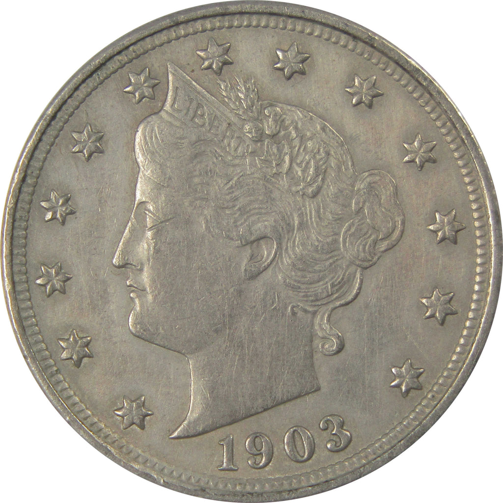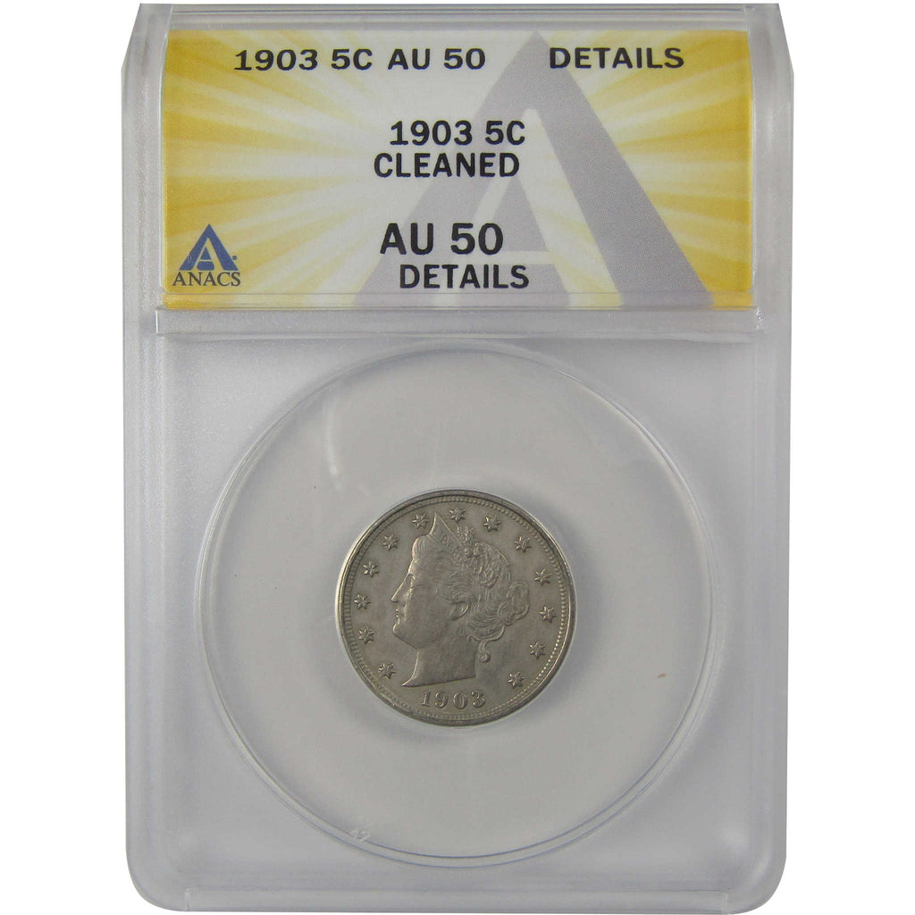 A genuine 1903 Liberty Head V Nickel Coin, graded and certified AU 50 Details by ANACS. Cleaned