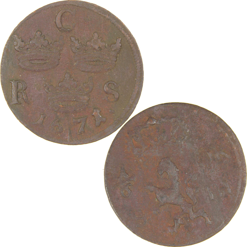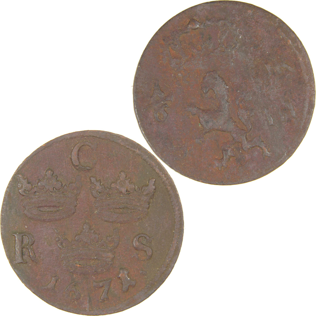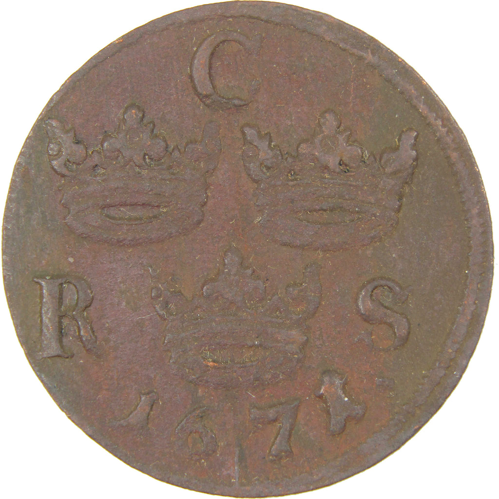 A genuine 1666-1686 Charles XI 1/6 Ore Copper Coin, in XF EF Extremely Fine Condition. Measures 25 mm in diameter and weighs 7.1 grams. The obverse shows three crowns, along with letters C R S, short for "Carolus Rex Sveciae" or "Charles, King of Sweden". The reverse shows a crowned rampant griffin. This coin is often off-centered and has several varieties in size and shape of crowns and lion.