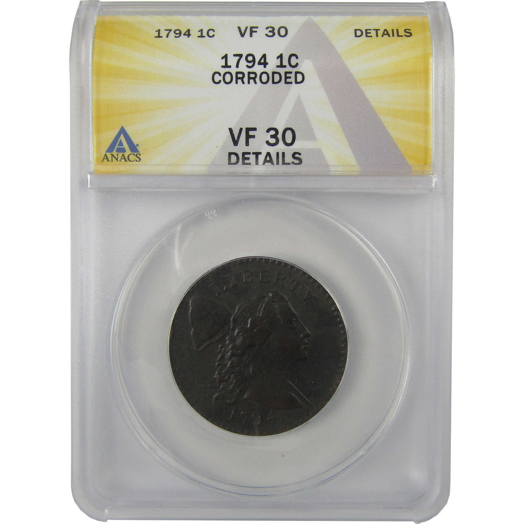A genuine 1794 Head of 1794 Liberty Cap Copper Large Cent Penny Coin, graded and certified VF 30 Details by ANACS. Corroded
