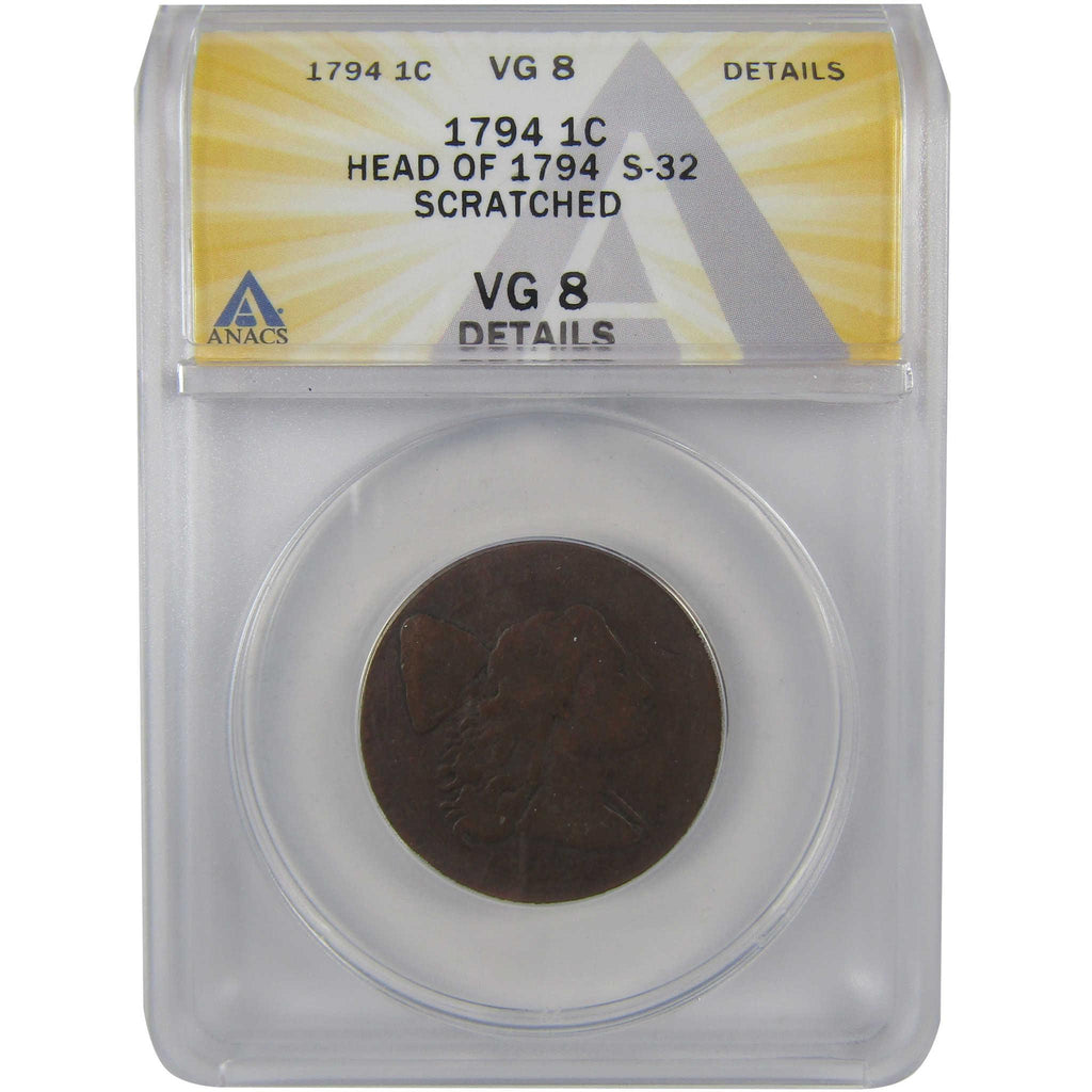 A genuine 1794 Head of 1794, S-32 Liberty Cap Copper Large Cent Penny Coin, graded and certified VG 8 Details by ANACS. Scratched