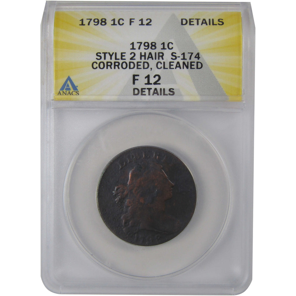 A genuine 1798 Style 2 Hair, S-174 Draped Bust Copper Large Cent Penny Coin, graded and certified F 12 Details by ANACS. Corroded, Cleaned