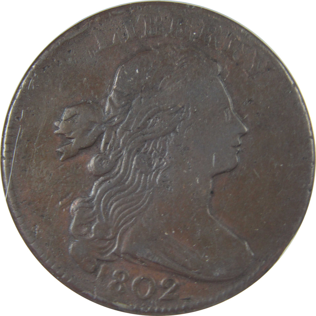 A genuine 1802 S-232 Draped Bust Copper Large Cent Penny Coin, graded and certified VF 20 Details by ANACS. Rim Clip, Cleaned
