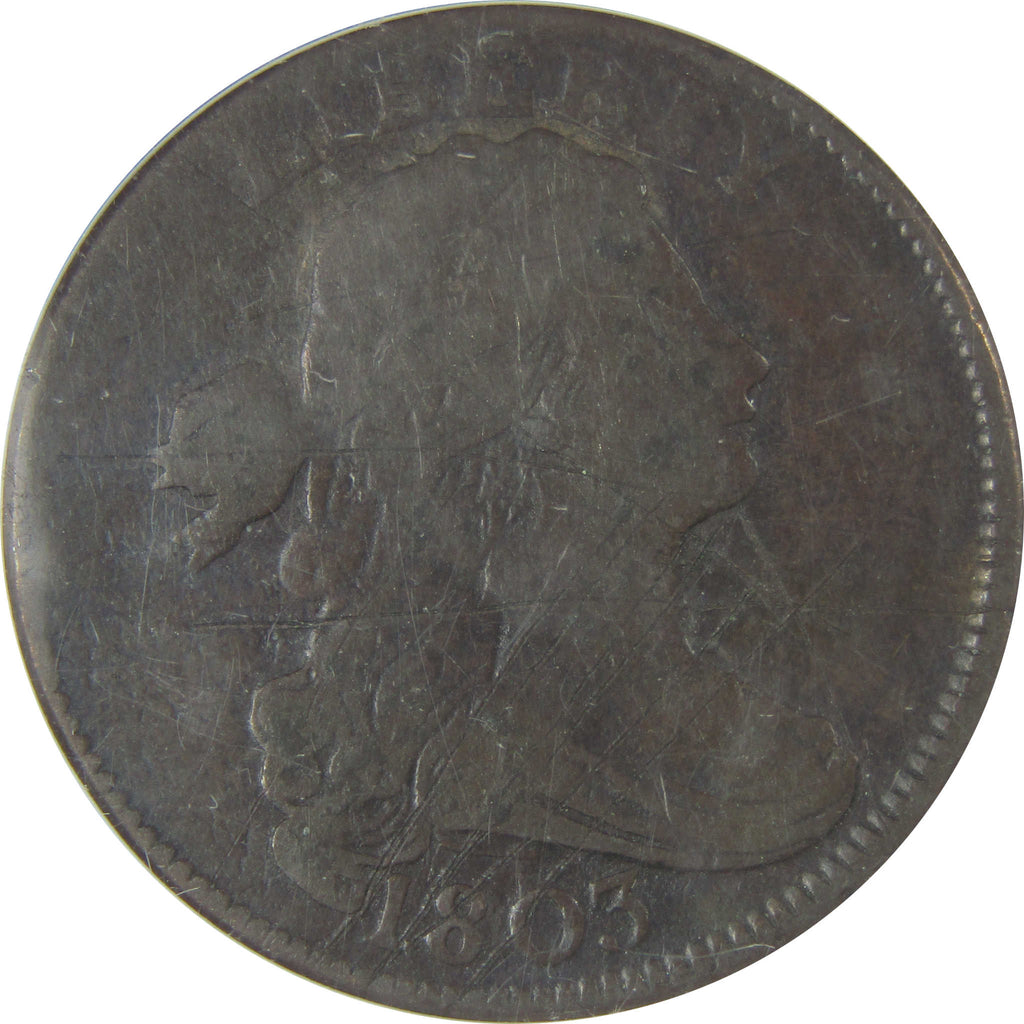 A genuine 1803 Small Date, Small Fraction Draped Bust Copper Large Cent Penny Coin, graded and certified F 12 Details by ANACS. Heavily Scratched