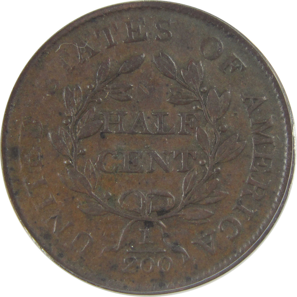 Struck over 200 years ago, this scarce copper half cent bears Robert Scot's classic Draped Bust design. The obverse shows Liberty with a ribbon in her flowing hair and a plunging neckline draped with linen. The reverse bears UNITED STATES OF AMERICA and the fraction 1/200 beneath a laurel wreath and HALF CENT.