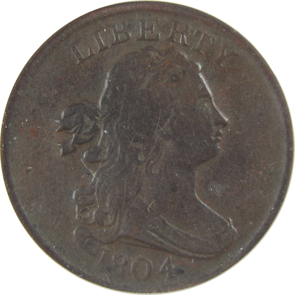 A genuine 1804 Plain 4, No Stems Draped Bust Copper Half Cent Penny Coin, graded and certified VF 25 by ANACS