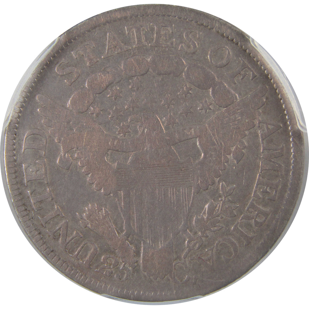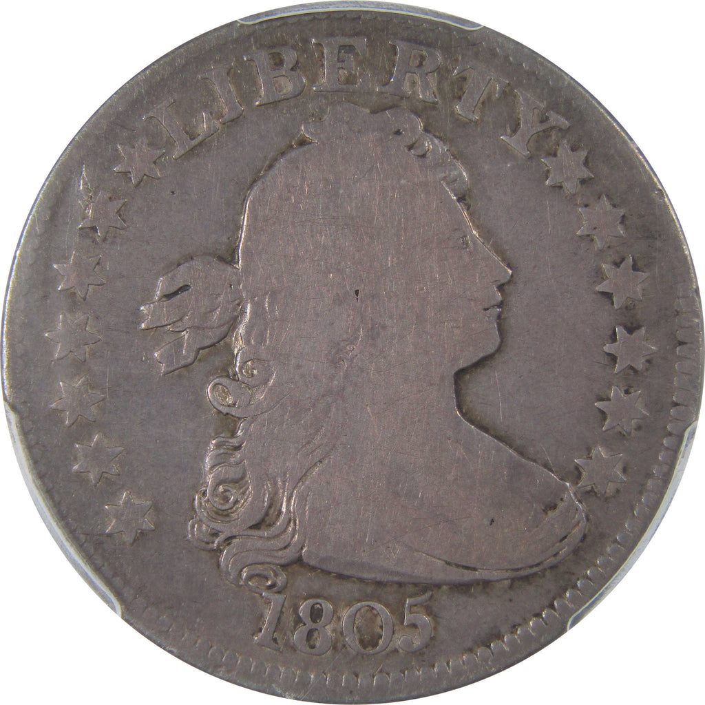 A genuine 1805 B-4 Draped Bust Silver Quarter Coin, graded and certified VG Details by PCGS. Contains 89.24% Silver. Cleaned