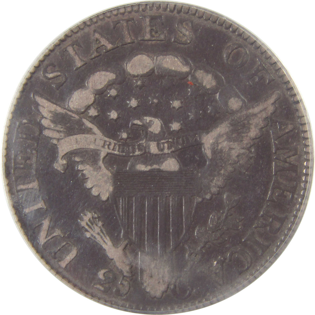 A genuine 1805 Draped Bust Silver Quarter Coin, graded and certified F 12 by ANACS. Contains 89.24% Silver. Obverse Lamination Mint Error