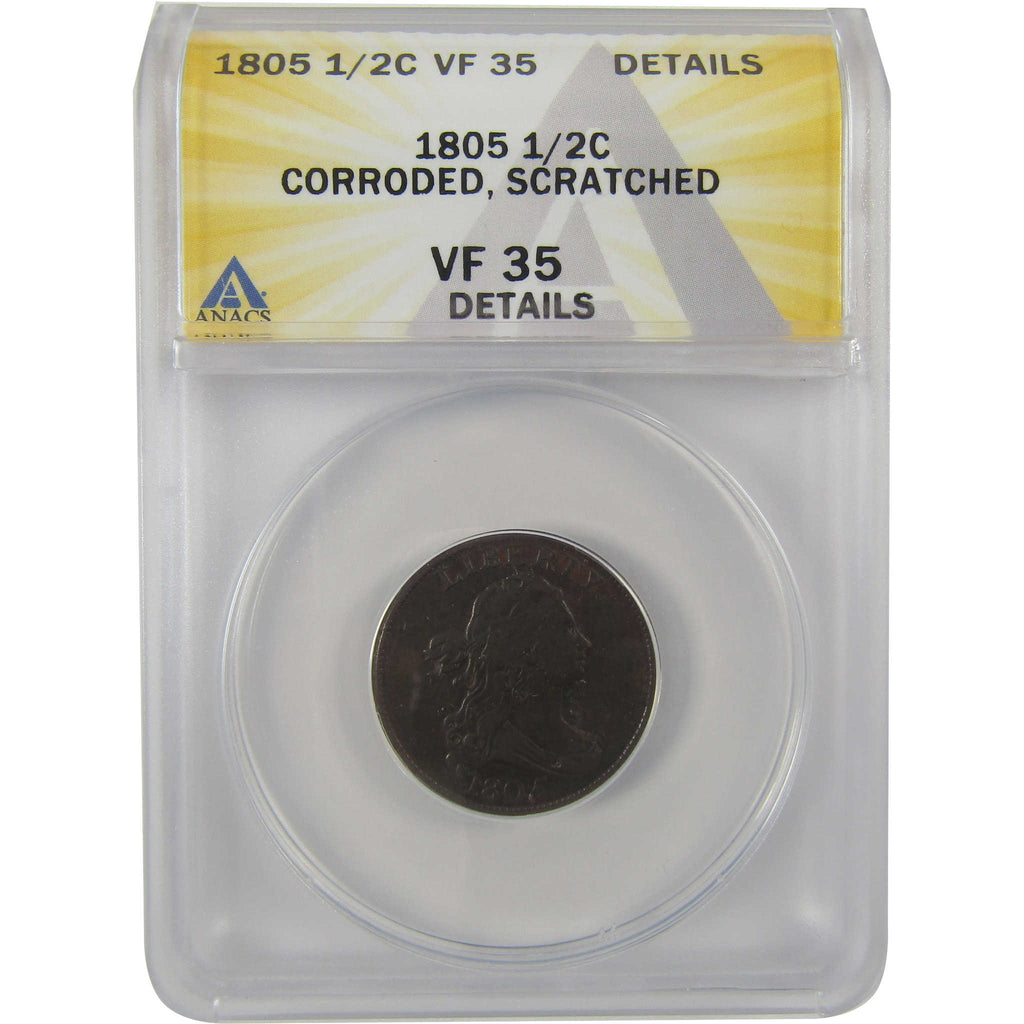 A genuine 1805 Large 5 with Stems Draped Bust Copper Half Cent Penny Coin, graded and certified VF 35 Details by ANACS. Corrosion, Scratches