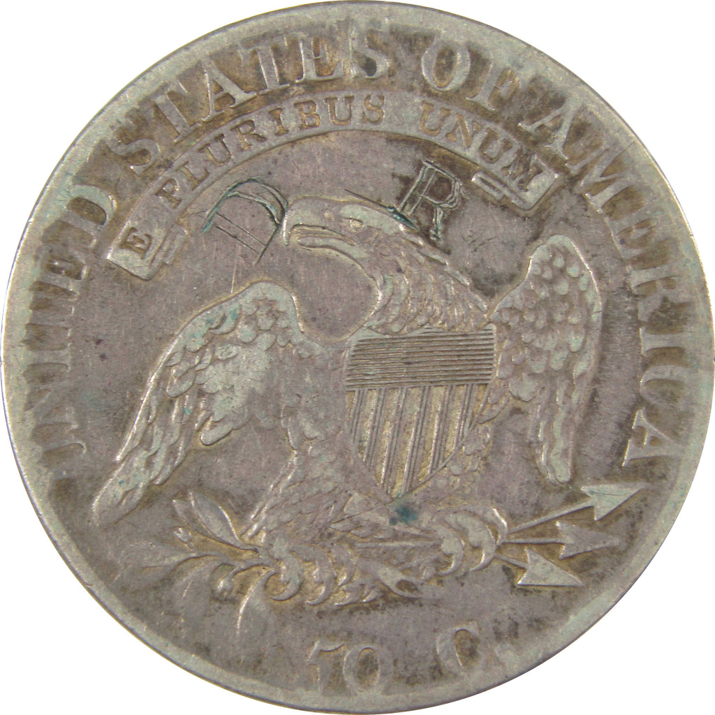 Struck over 180 years ago, this 89% silver Capped Bust half dollar bears John Reich's classic design. It depicts Liberty with long, curling hair and a cloth cap, surrounded by 13 stars and the date. The reverse shows an American eagle with Union Shield, an olive branch and three arrows. A banner above the eagle reads E PLURIBUS UNUM, with 50 c. below and UNITED STATES OF AMERICA surrounding. Inscribed along the coin's edge is FIFTY CENTS or HALF A DOLLAR.