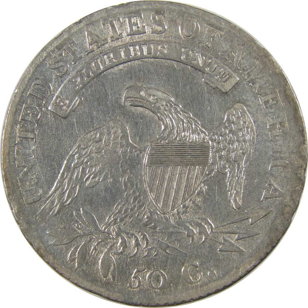 Struck over 180 years ago, this 89% silver Capped Bust half dollar bears John Reich's classic design. It depicts Liberty with long, curling hair and a cloth cap, surrounded by 13 stars and the date. The reverse shows an American eagle with Union Shield, an olive branch and three arrows. A banner above the eagle reads E PLURIBUS UNUM, with 50 c. below and UNITED STATES OF AMERICA surrounding. Inscribed along the coin's edge is FIFTY CENTS or HALF A DOLLAR.