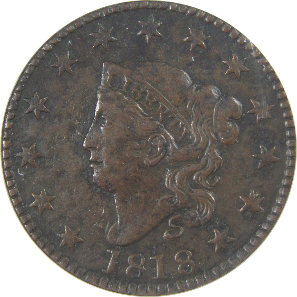 A genuine 1818 N-7 Coronet Head Copper Large Cent Penny Coin, graded and certified VF 30 Details by ANACS. Corroded