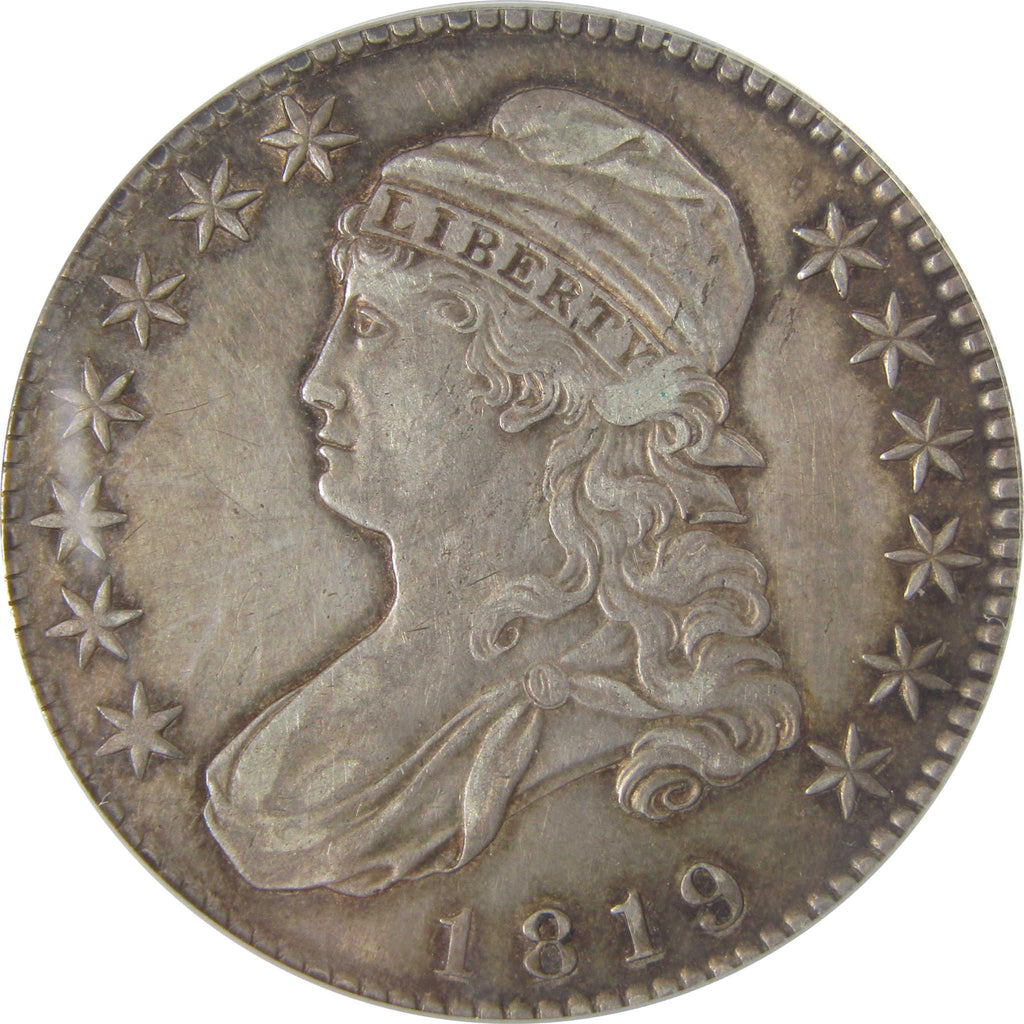 A genuine 1819 Capped Bust Silver Half Dollar Coin, graded and certified AU 50 Details by ANACS. Contains 89.24% Silver. Cleaned