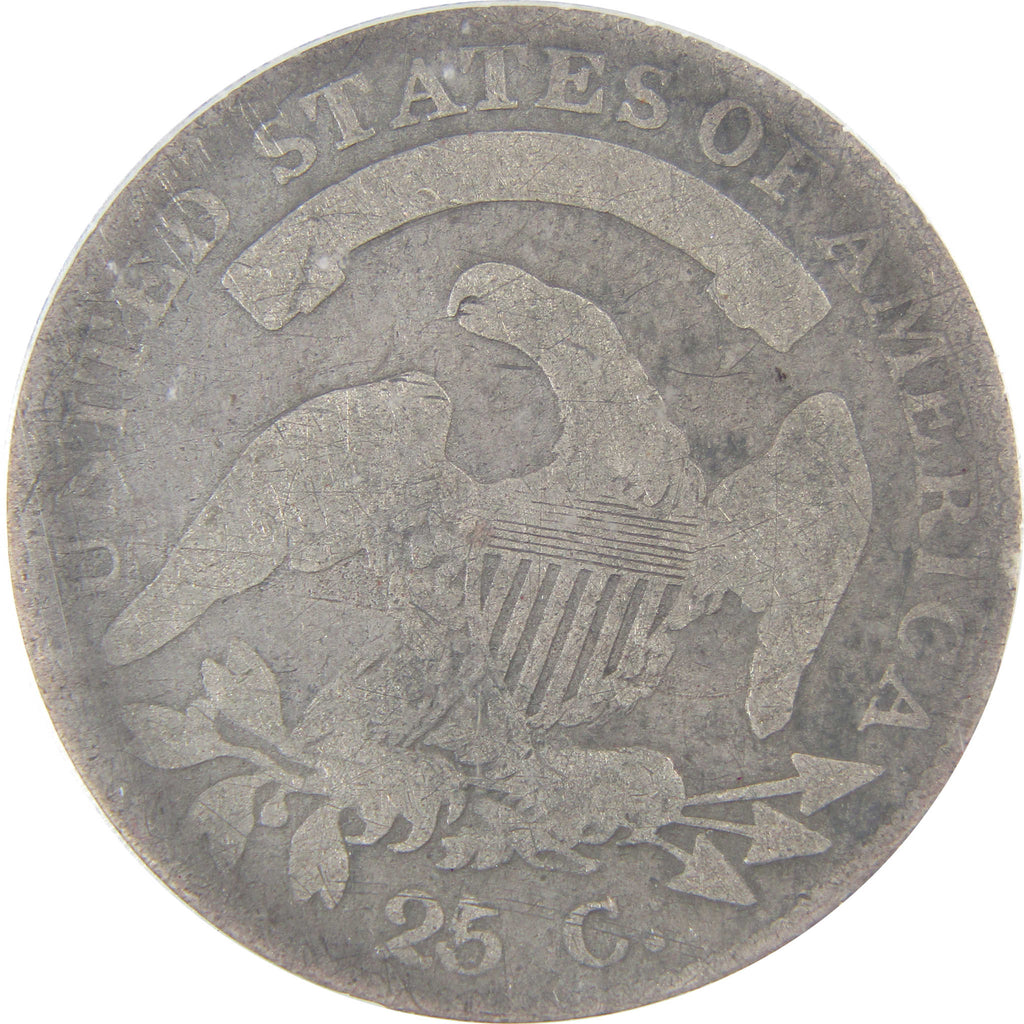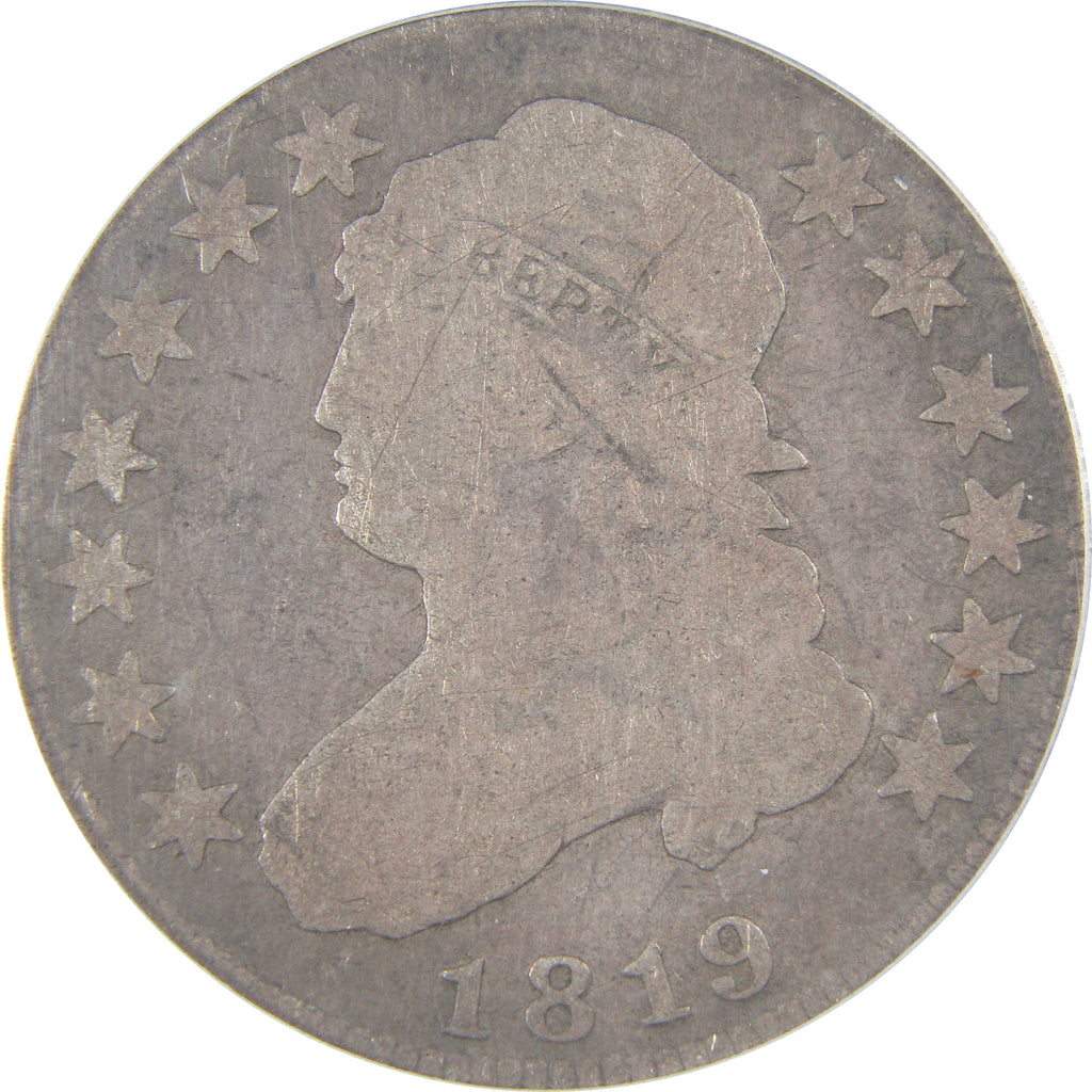 A genuine 1819 Large 9 Capped Bust Silver Quarter Coin, graded and certified G 6 by ICG. Contains 89.24% Silver