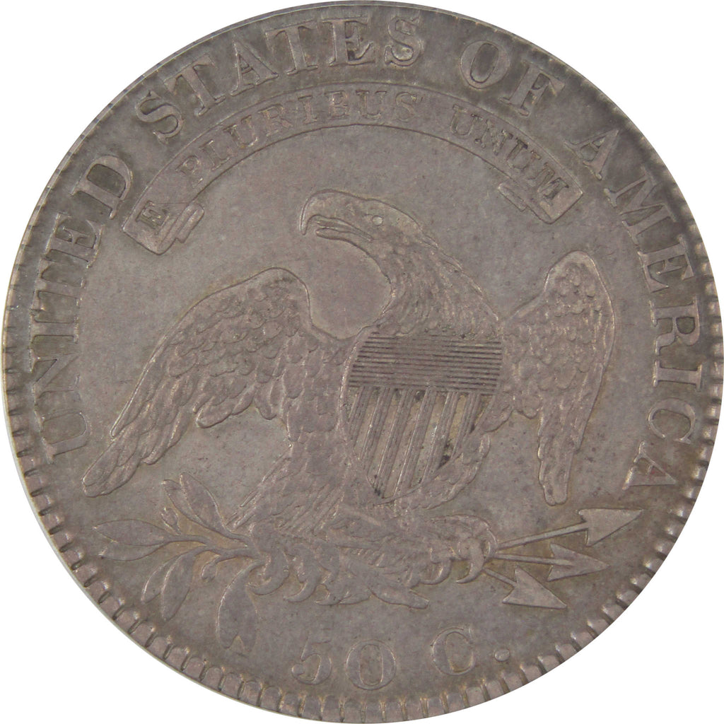 Struck over 180 years ago, this 89% silver Capped Bust half dollar bears John Reich's classic design. It depicts Liberty with long, curling hair and a cloth cap, surrounded by 13 stars and the date. The reverse shows an American eagle with Union Shield, an olive branch and three arrows. A banner above the eagle reads E PLURIBUS UNUM, with 50 c. below and UNITED STATES OF AMERICA surrounding. Inscribed along the coin's edge is FIFTY CENTS or HALF A DOLLAR.