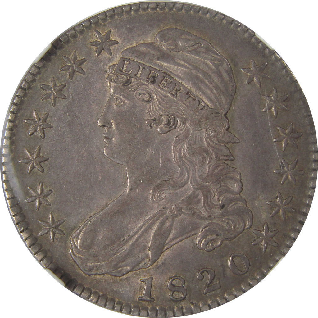 A genuine 1820 Square Base, Knob 2, Large Date Capped Bust Silver Half Dollar Coin, graded and certified AU 55 by NGC. Contains 89.24% Silver
