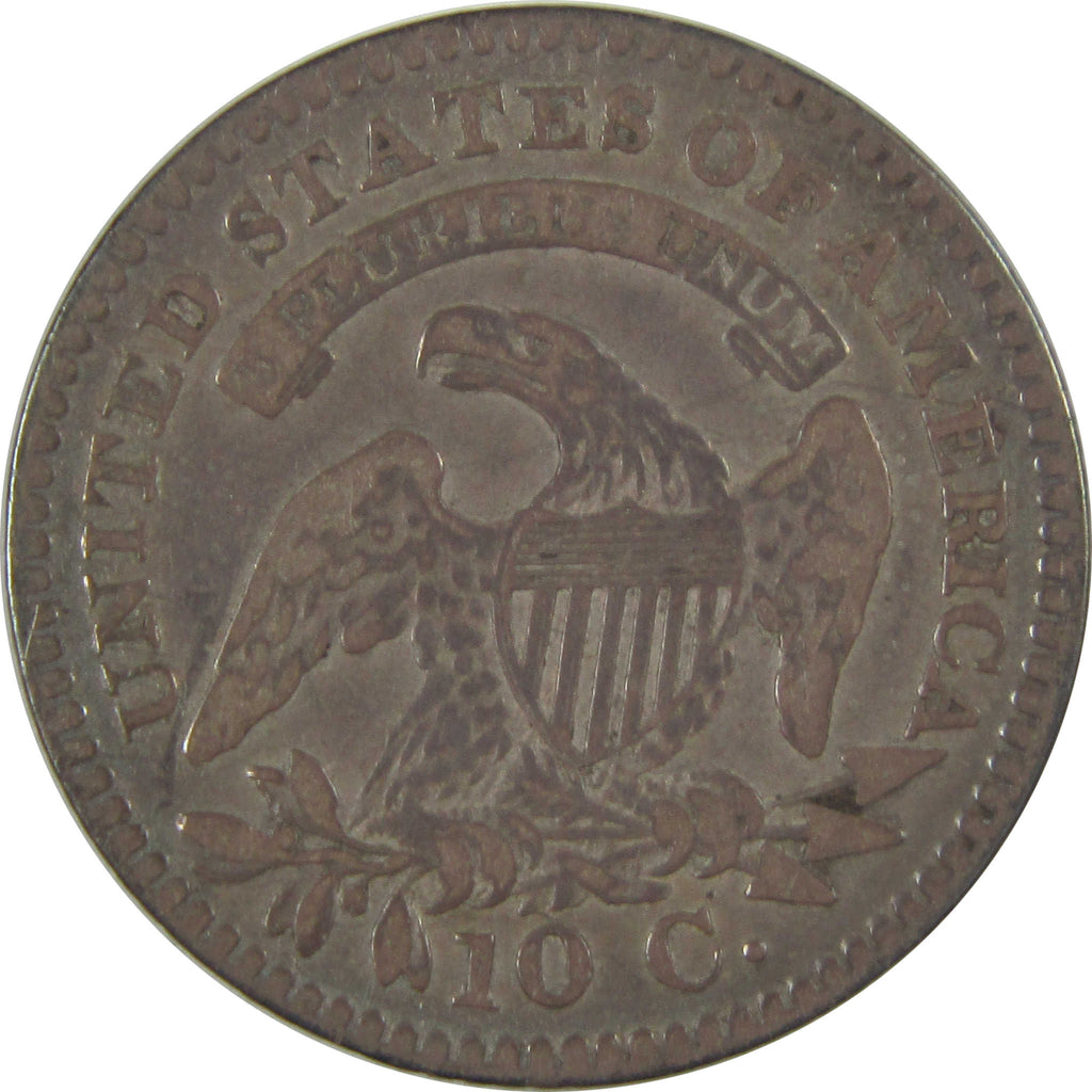 Designed by John Reich, this classic silver dime depicts Liberty on the obverse with hair beneath a cloth cap surrounded by 13 stars. Its reverse features the denomination 10 c. beneath an eagle with shield on a branch holding three arrows.