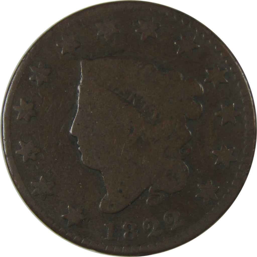 A genuine 1822 Coronet Head Copper Large Cent Penny Coin, in G Good Condition