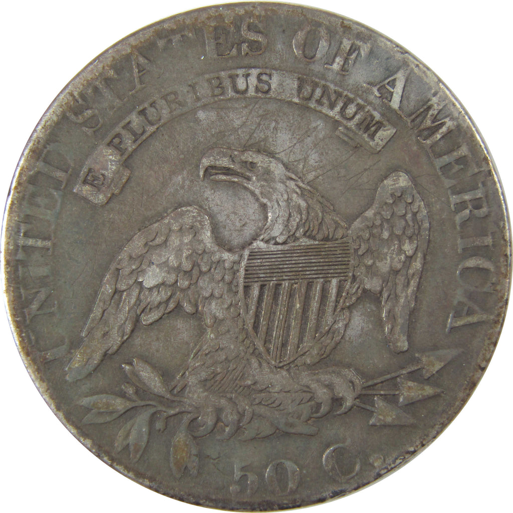 Struck over 180 years ago, this 89% silver Capped Bust half dollar bears John Reich's classic design. It depicts Liberty with long, curling hair and a cloth cap, surrounded by 13 stars and the date. The reverse shows an American eagle with Union Shield, an olive branch and three arrows. A banner above the eagle reads E PLURIBUS UNUM, with 50 c. below and UNITED STATES OF AMERICA surrounding. Inscribed along the coin's edge is FIFTY CENTS or HALF A DOLLAR.