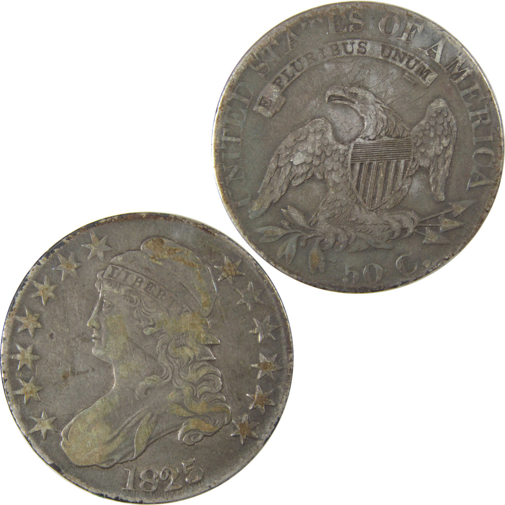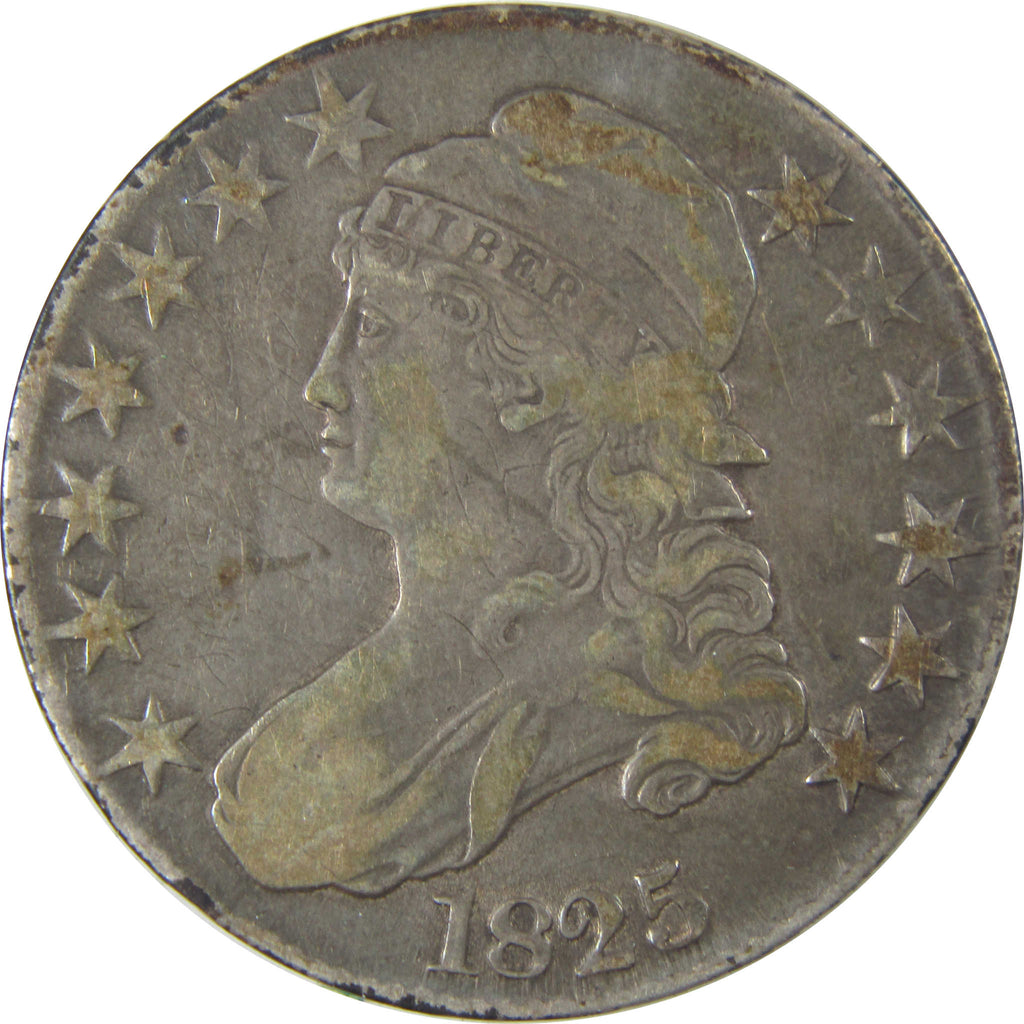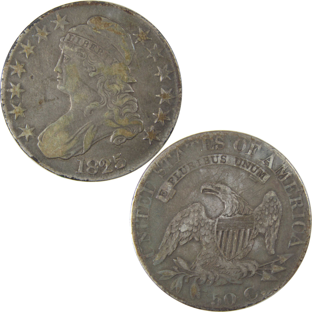 A genuine 1825 Capped Bust Silver Half Dollar Coin, in F Fine Details Condition. Contains 89.24% Silver. Graffiti