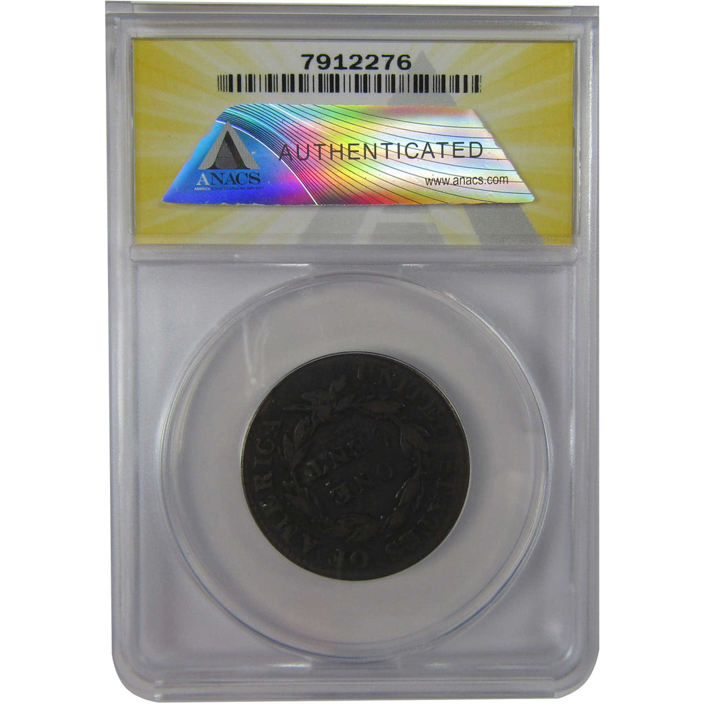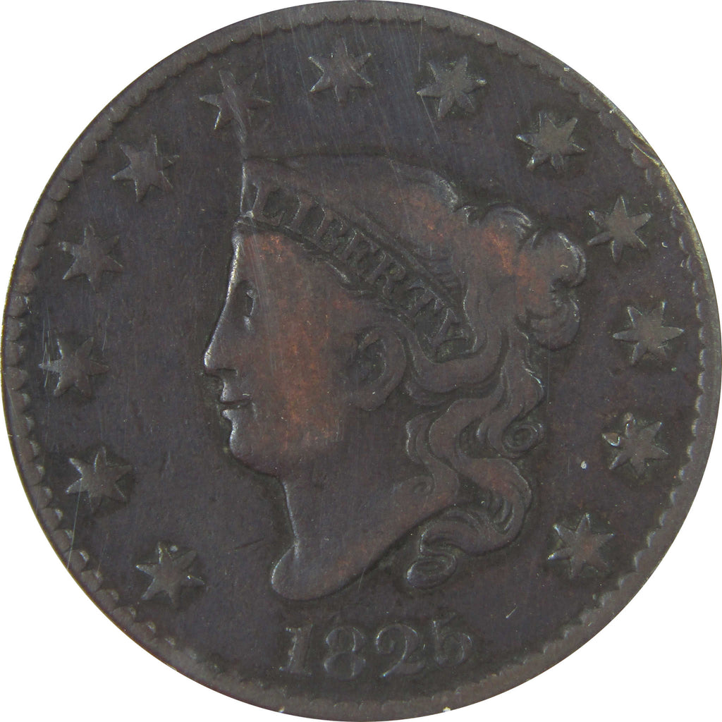 A genuine 1825 Coronet Head Copper Large Cent Penny Coin, graded and certified VG 10 by ANACS
