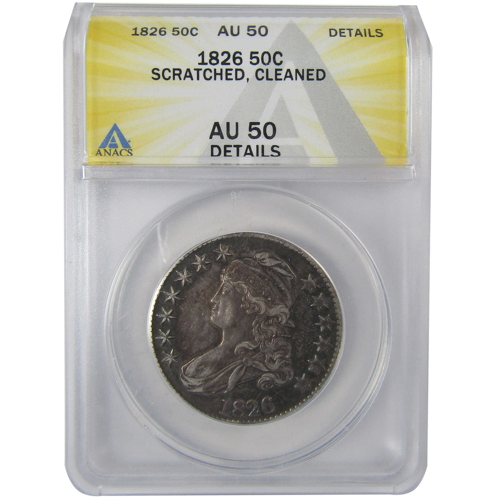 A genuine 1826 Capped Bust Silver Half Dollar Coin, graded and certified AU 50 Details by ANACS. Contains 89.24% Silver. Scratched, Cleaned