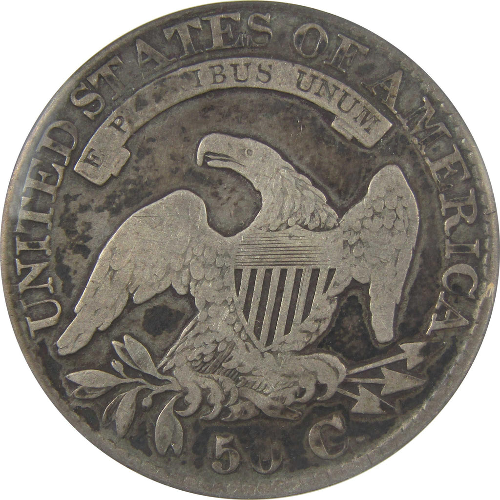 Struck over 180 years ago, this 89% silver Capped Bust half dollar bears John Reich's classic design. It depicts Liberty with long, curling hair and a cloth cap, surrounded by 13 stars and the date. The reverse shows an American eagle with Union Shield, an olive branch and three arrows. A banner above the eagle reads E PLURIBUS UNUM, with 50 c. below and UNITED STATES OF AMERICA surrounding. Inscribed along the coin's edge is FIFTY CENTS or HALF A DOLLAR.