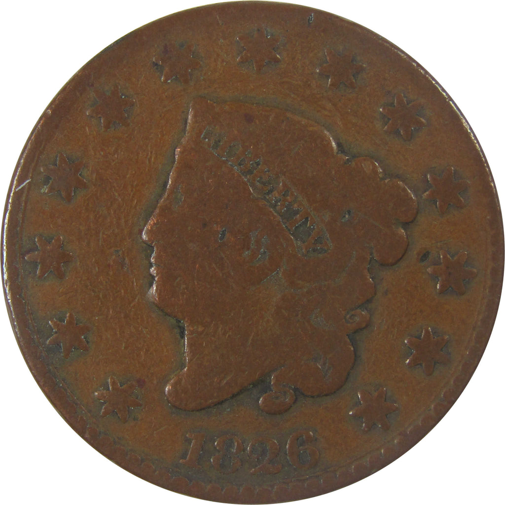 A genuine 1826 Coronet Head Copper Large Cent Penny Coin, in VG Very Good Details Condition. Corrosion