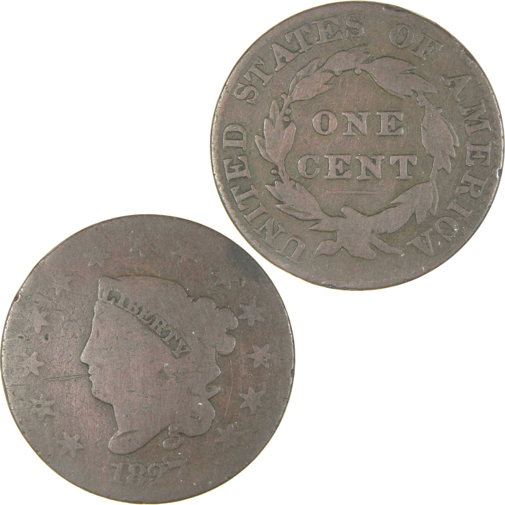 Struck over 180 years ago, this copper Coronet Head large cent - also called the Matron Head large cent - is 50% larger than today's cents. It depicts a more serious Liberty, with a diadem inscribed LIBERTY and long hair in a bun held by plain cords. The reverse shows ONE CENT surrounded by a laurel wreath and UNITED STATES OF AMERICA.