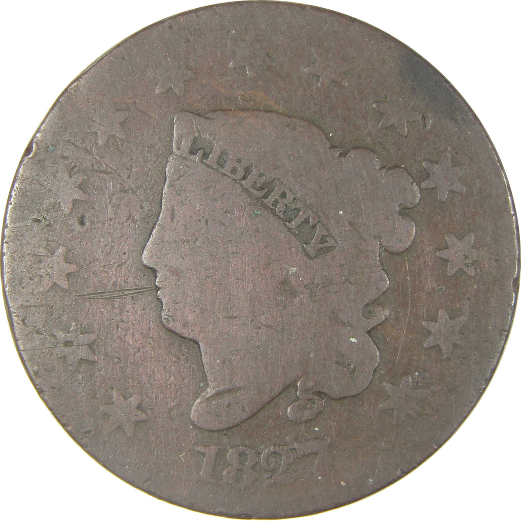 A genuine 1827 Coronet Head Copper Large Cent Penny Coin, in AG About Good Condition