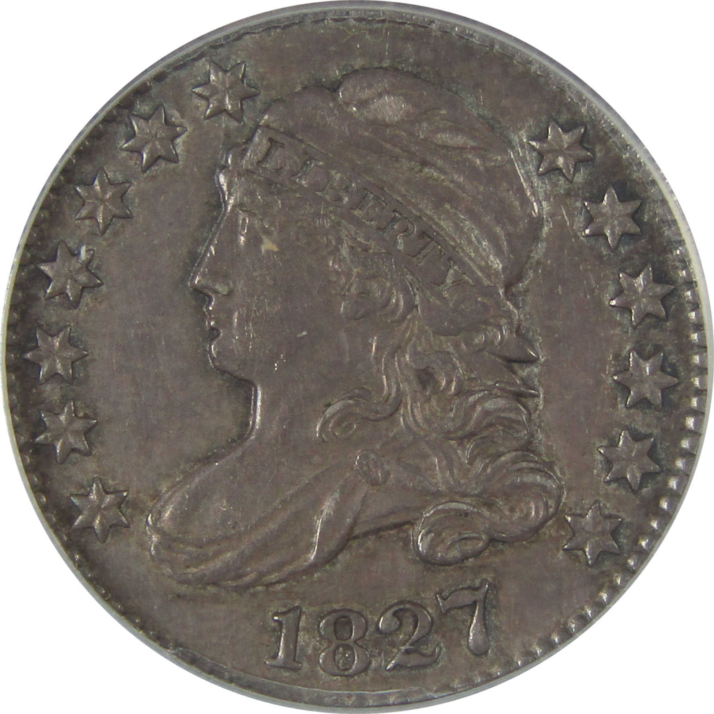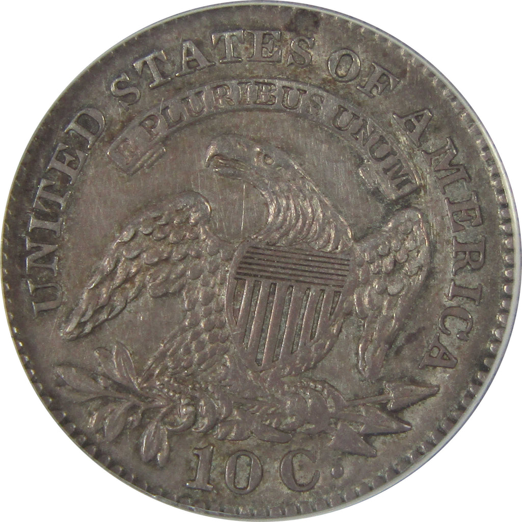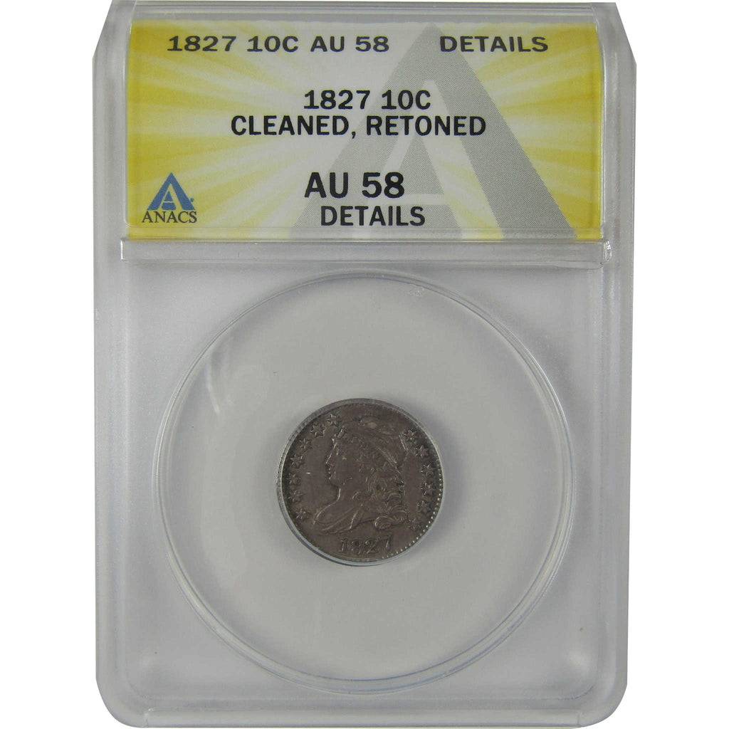 A genuine 1827 Pointed Top Capped Bust Silver Dime Coin, graded and certified AU 58 Details by ANACS. Contains 89.24% Silver. Cleaned, Retoned