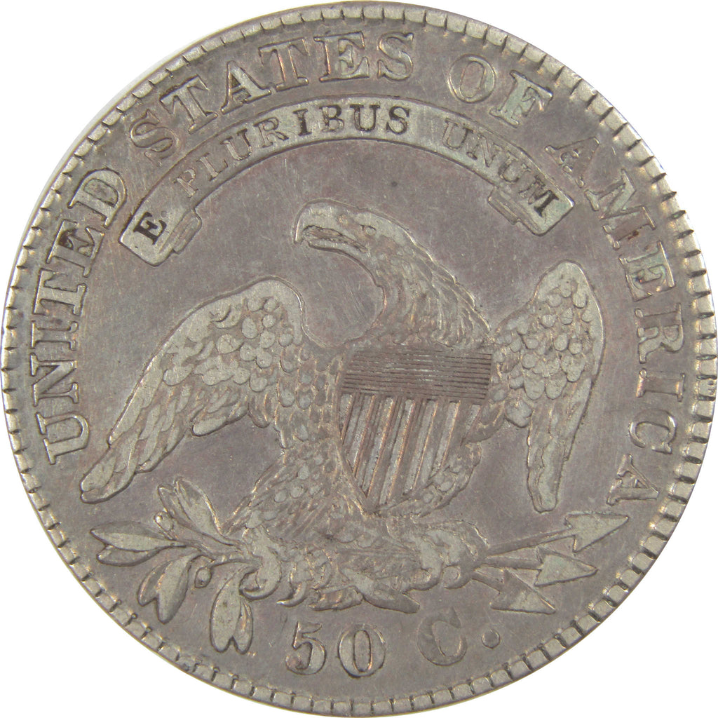 Struck over 180 years ago, this 89% silver Capped Bust half dollar bears John Reich's classic design. It depicts Liberty with long, curling hair and a cloth cap, surrounded by 13 stars and the date. The reverse shows an American eagle with Union Shield, an olive branch and three arrows. A banner above the eagle reads E PLURIBUS UNUM, with 50 c. below and UNITED STATES OF AMERICA surrounding. Inscribed along the coin's edge is FIFTY CENTS or HALF A DOLLAR.