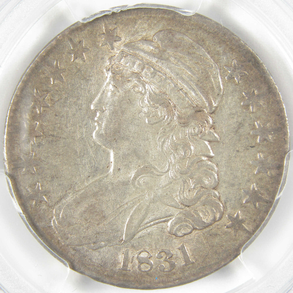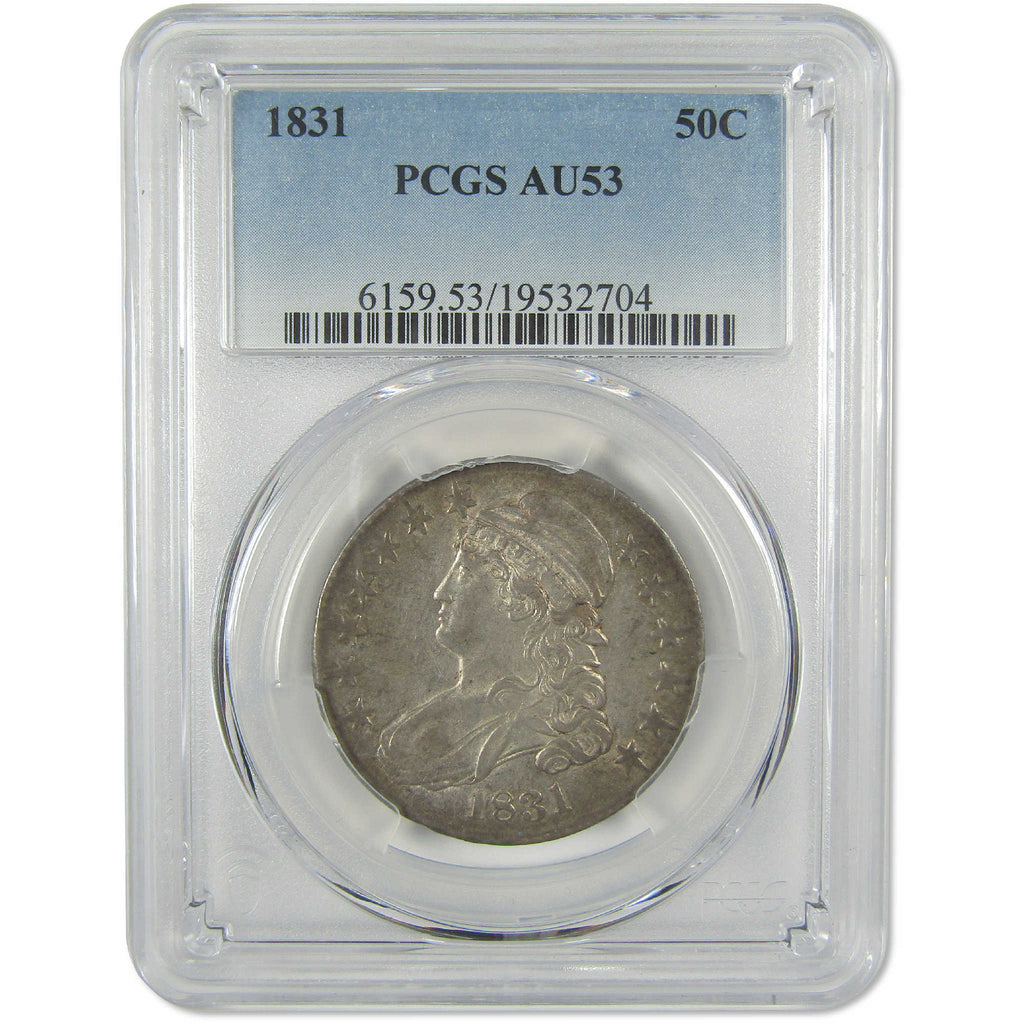 A genuine 1831 Capped Bust Silver Half Dollar Coin, graded and certified AU 53 by PCGS. Contains 89.24% Silver
