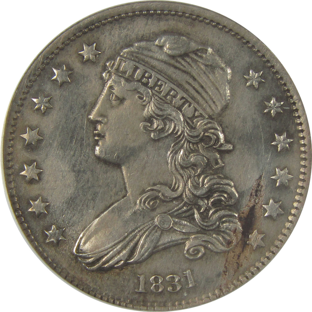 A genuine 1831 Large Letters, B-5 Capped Bust Silver Quarter Coin, graded and certified MS 60 Details by ANACS. Contains 89.24% Silver. Obverse Lamination, Cleaned