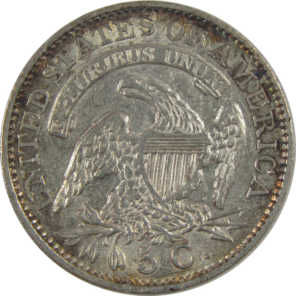 Struck over 180 years ago, this silver Capped Bust half dime bears John Reich's classic design. It depicts 13 stars around Liberty in a cloth cap, her curly hair reaching her shoulder where a brooch secures her gown. The reverse bears UNITED STATES OF AMERICA around an American eagle with Union Shield holding an olive branch and three arrows. The denomination 5 c. is below the eagle, with E PLURIBUS UNUM on a banner above.