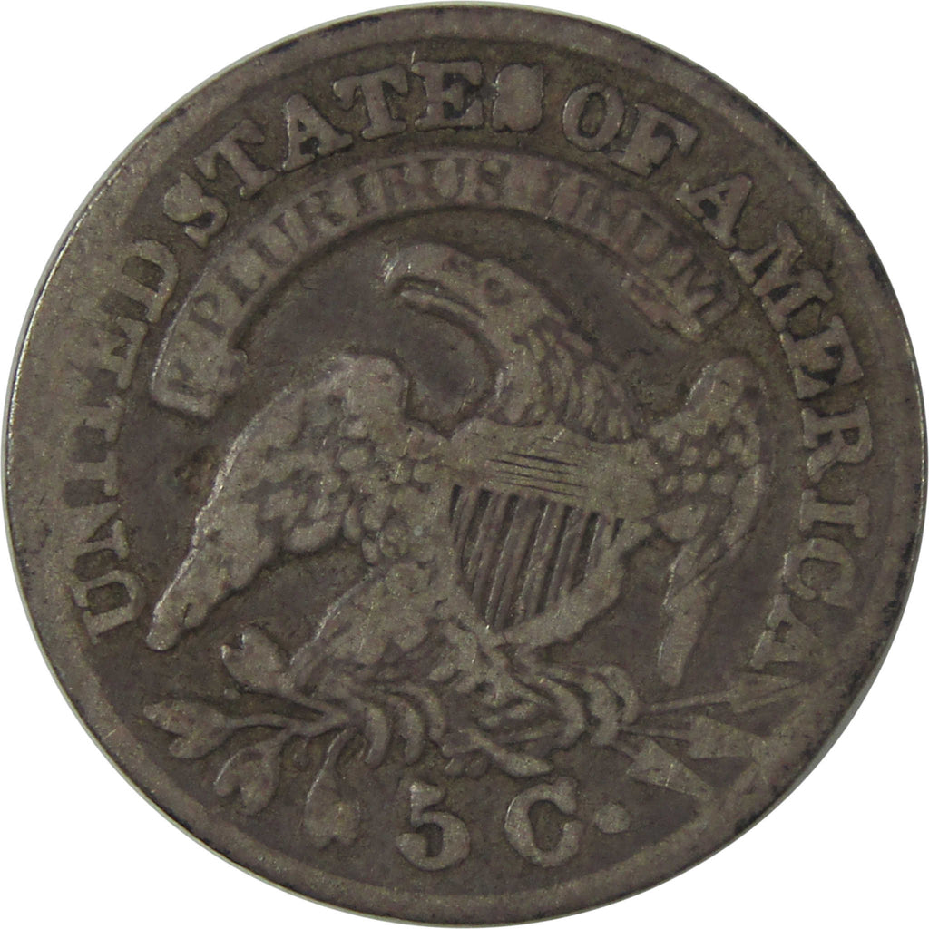 Struck over 180 years ago, this silver Capped Bust half dime bears John Reich's classic design. It depicts 13 stars around Liberty in a cloth cap, her curly hair reaching her shoulder where a brooch secures her gown. The reverse bears UNITED STATES OF AMERICA around an American eagle with Union Shield holding an olive branch and three arrows. The denomination 5 c. is below the eagle, with E PLURIBUS UNUM on a banner above.