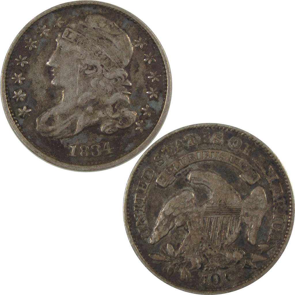 A genuine 1834 Small 4 Capped Bust Silver Dime Coin, in VF Very Fine Condition. Contains 89.24% Silver