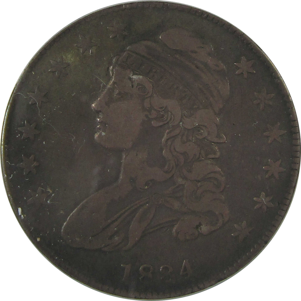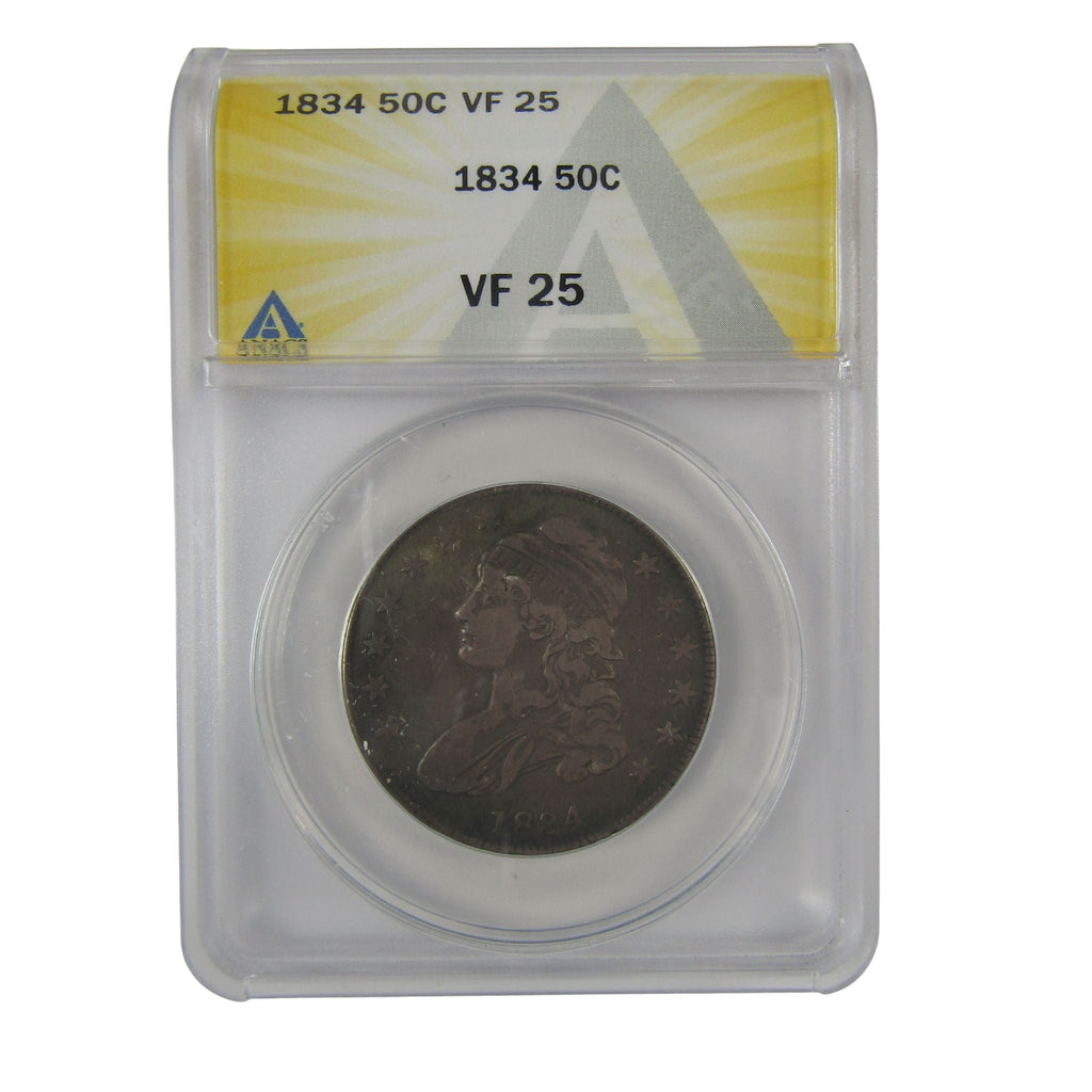 A genuine 1834 Small Date, Stars and Letters Capped Bust Silver Half Dollar Coin, graded and certified VF 25 by ANACS. Contains 89.24% Silver