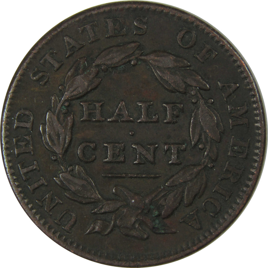 Struck over 180 years ago, this scarce copper half cent bears John Reich's Classic Head design. The obverse depicts Liberty with curly hair held by a band inscribed LIBERTY. The reverse bears HALF CENT surrounded by a laurel wreath and UNITED STATES OF AMERICA.