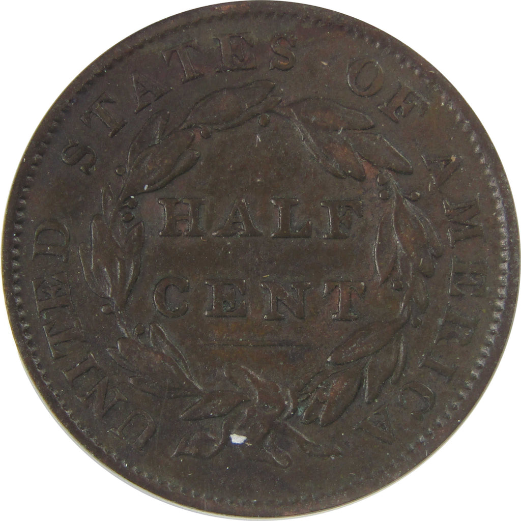 Struck over 180 years ago, this scarce copper half cent bears John Reich's Classic Head design. The obverse depicts Liberty with curly hair held by a band inscribed LIBERTY. The reverse bears HALF CENT surrounded by a laurel wreath and UNITED STATES OF AMERICA.