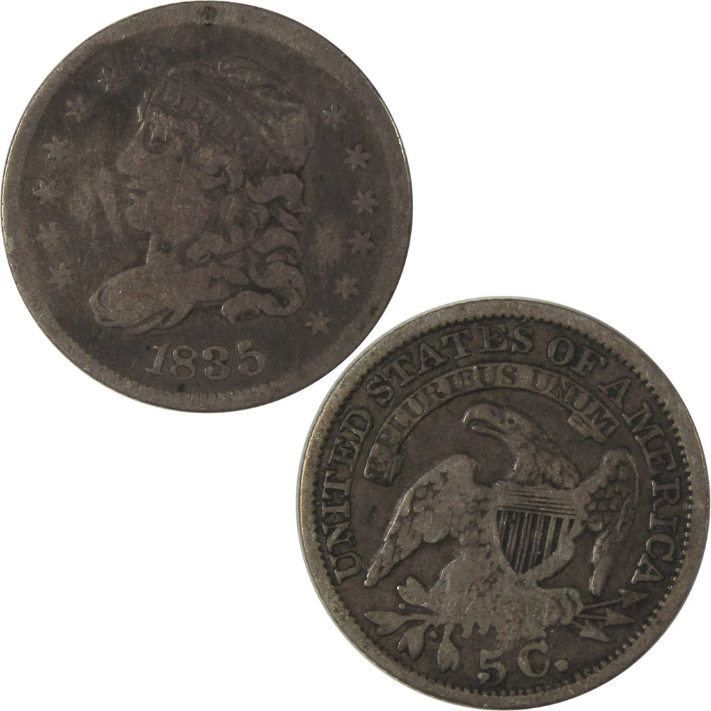 A genuine 1835 Large Date and 5C Capped Bust Silver Half Dime Coin, in VG Very Good Details Condition. Contains 89.24% Silver. Bent