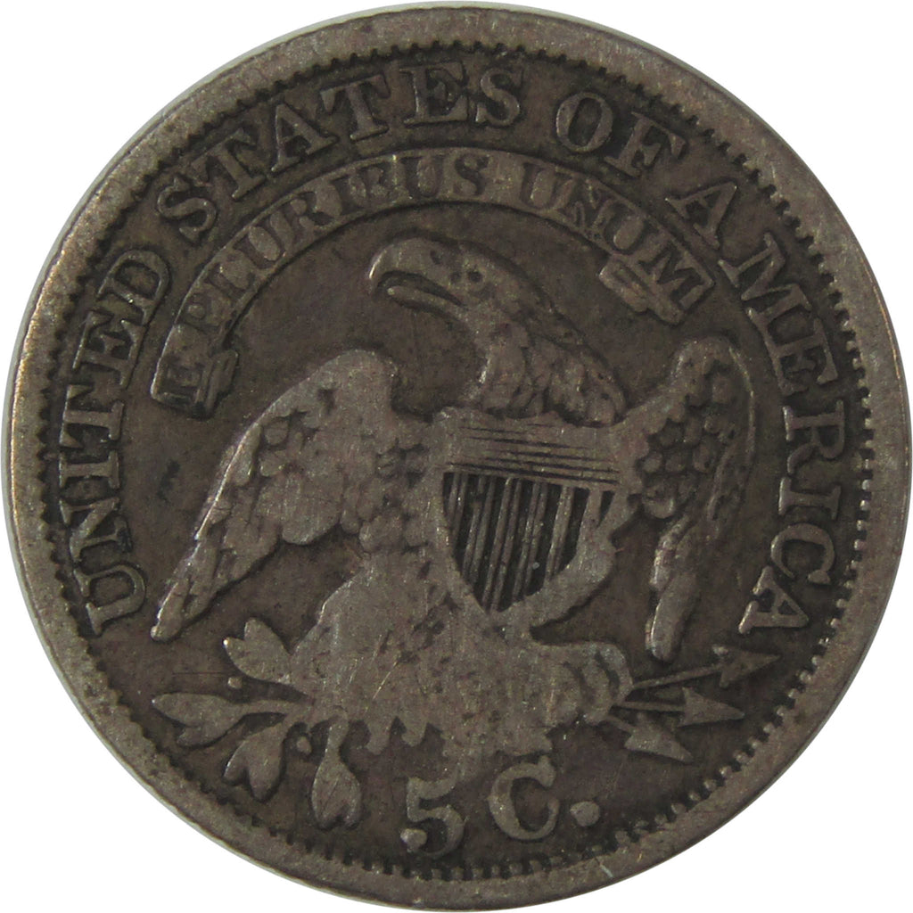 Struck over 180 years ago, this silver Capped Bust half dime bears John Reich's classic design. It depicts 13 stars around Liberty in a cloth cap, her curly hair reaching her shoulder where a brooch secures her gown. The reverse bears UNITED STATES OF AMERICA around an American eagle with Union Shield holding an olive branch and three arrows. The denomination 5 c. is below the eagle, with E PLURIBUS UNUM on a banner above.