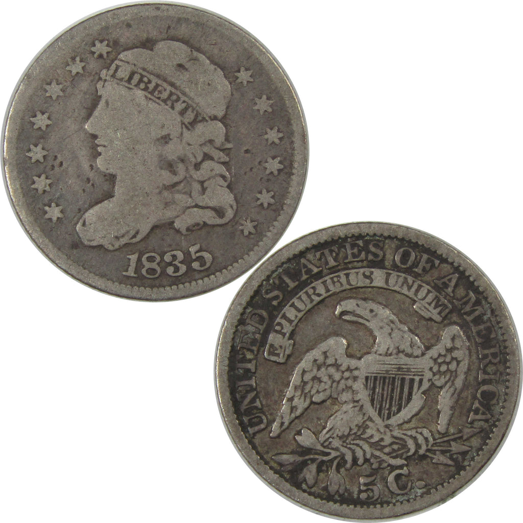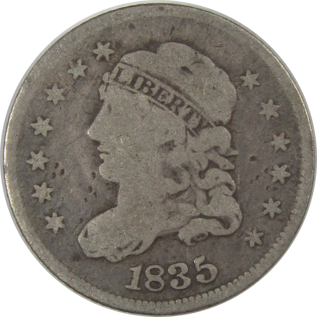 A genuine 1835 Large Date and 5C Capped Bust Silver Half Dime Coin, in VG Very Good Condition. Contains 89.24% Silver