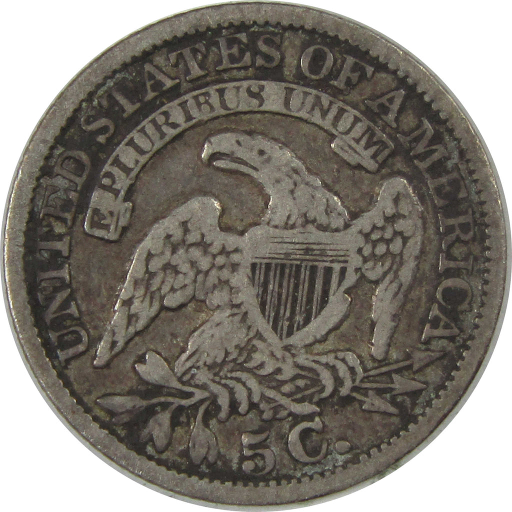 Struck over 180 years ago, this silver Capped Bust half dime bears John Reich's classic design. It depicts 13 stars around Liberty in a cloth cap, her curly hair reaching her shoulder where a brooch secures her gown. The reverse bears UNITED STATES OF AMERICA around an American eagle with Union Shield holding an olive branch and three arrows. The denomination 5 c. is below the eagle, with E PLURIBUS UNUM on a banner above.