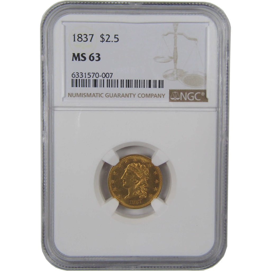 A genuine 1837 $2.50 Classic Head Gold Quarter Eagle Coin, graded and certified MS 63 by NGC. Contains 90% Gold