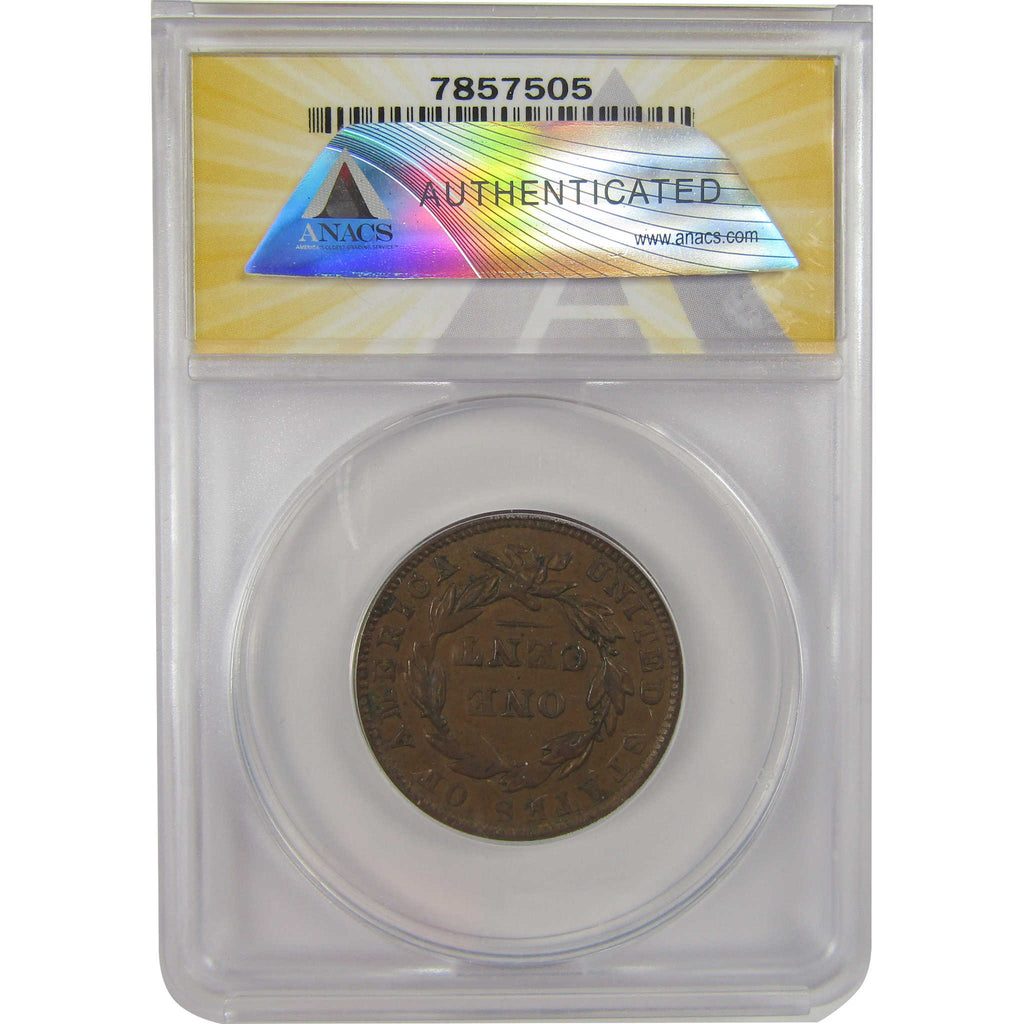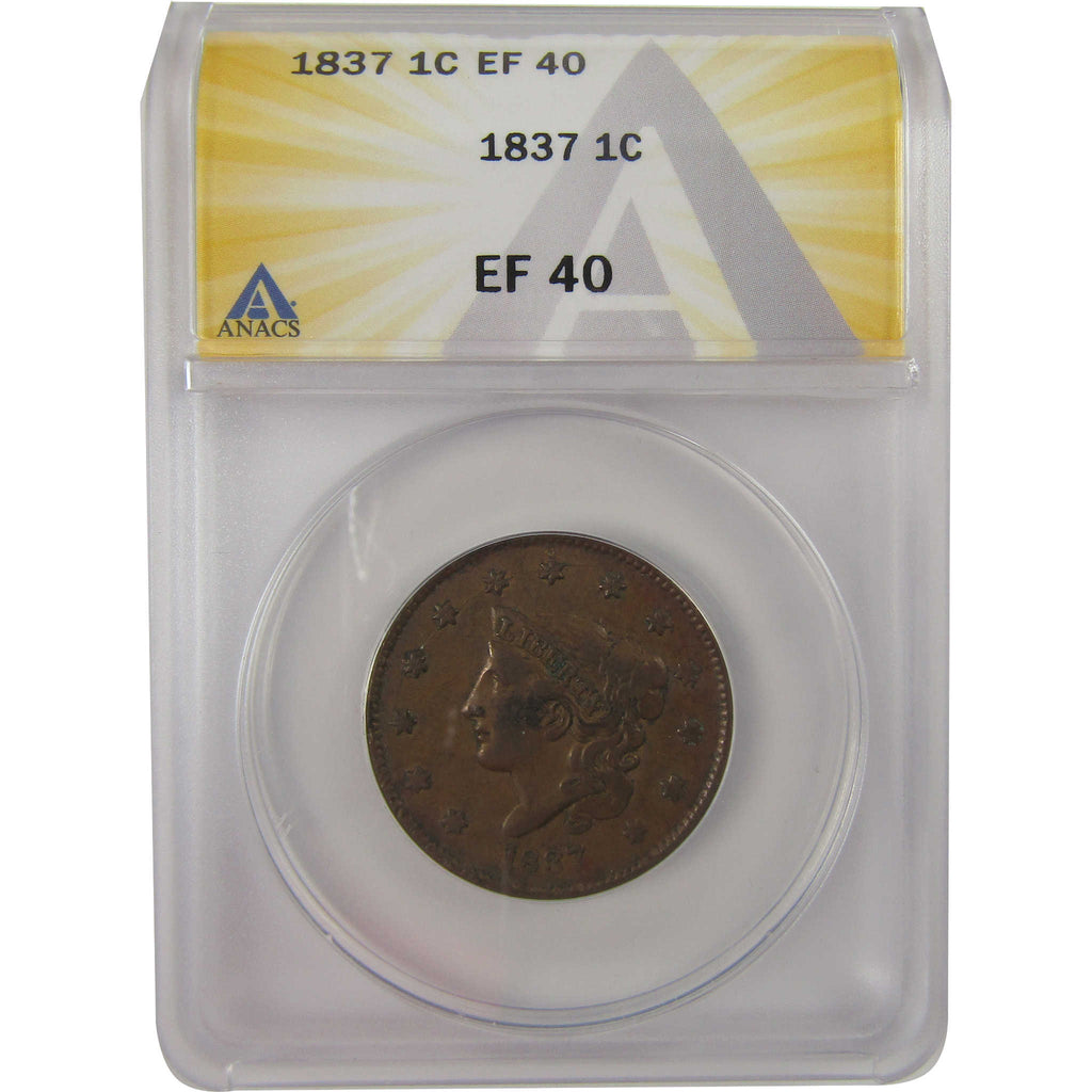 A genuine 1837 Plain Cord, Small Letters Coronet Head Copper Large Cent Penny Coin, graded and certified EF 40 by ANACS