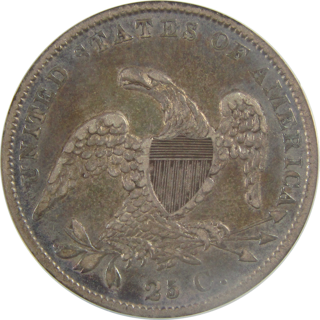 Struck over 180 years ago, this Capped Bust silver quarter bears John Reich's Capped Bust design, which William Kneass modified. It depicts Liberty in a cloth cap, surrounded by 13 stars and the date of issue. The reverse shows an American eagle with Union Shield, an olive branch and three arrows. Encircling the eagle are 25 c. and UNITED STATES OF AMERICA.