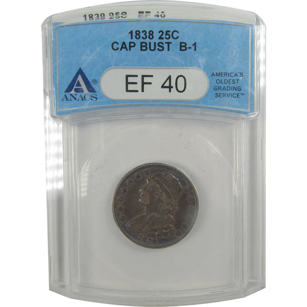 A genuine 1838 B-1 Capped Bust Silver Quarter Coin, graded and certified EF 40 by ANACS. Contains 90% Silver