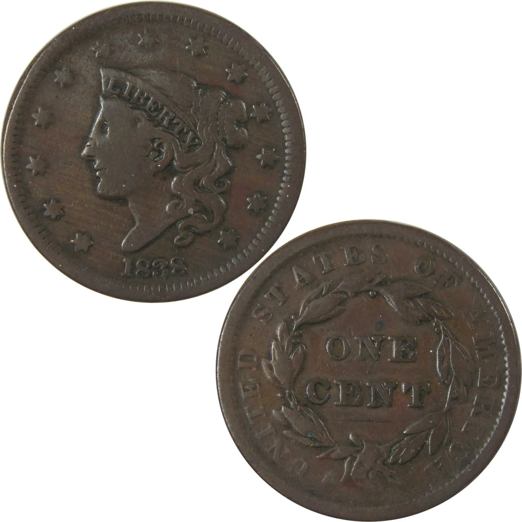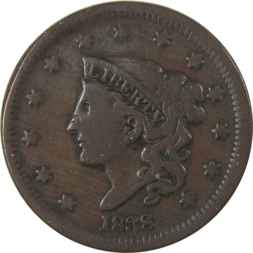 A genuine 1838 Coronet Head Copper Large Cent Penny Coin, in VG Very Good Condition